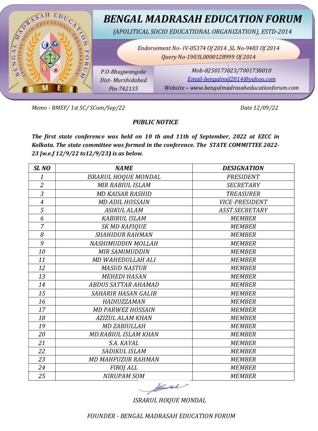 Bengal Madrasah Education Forum (Registration No – IV 05374 of 2014), an apolitical teachers organisation, is monitored by the teachers of government aided madrasahs and the unemployed youths of the state of West Bengal, who want to reinstate West Bengal Madrasah Service Commission (WBMSC) in its former place. It arranges all sorts of activities for the welfare of teachers, students and people in general in the field of education and fights to preserve the various rights of which they are entitled to. The members of Bengal Madrasah Education Forum also serve voluntarily in various fields such as helping the common people in natural disasters or spreading epidemics and viral diseases, donating blood to the people facing critical illness/injuries. They are spreading awareness among the masses to fight against various types of corruptions, malpractices, addictions those exist in our society. In short, BMEF is an apolitical teacher organisation having a broader vision of social welfare.
